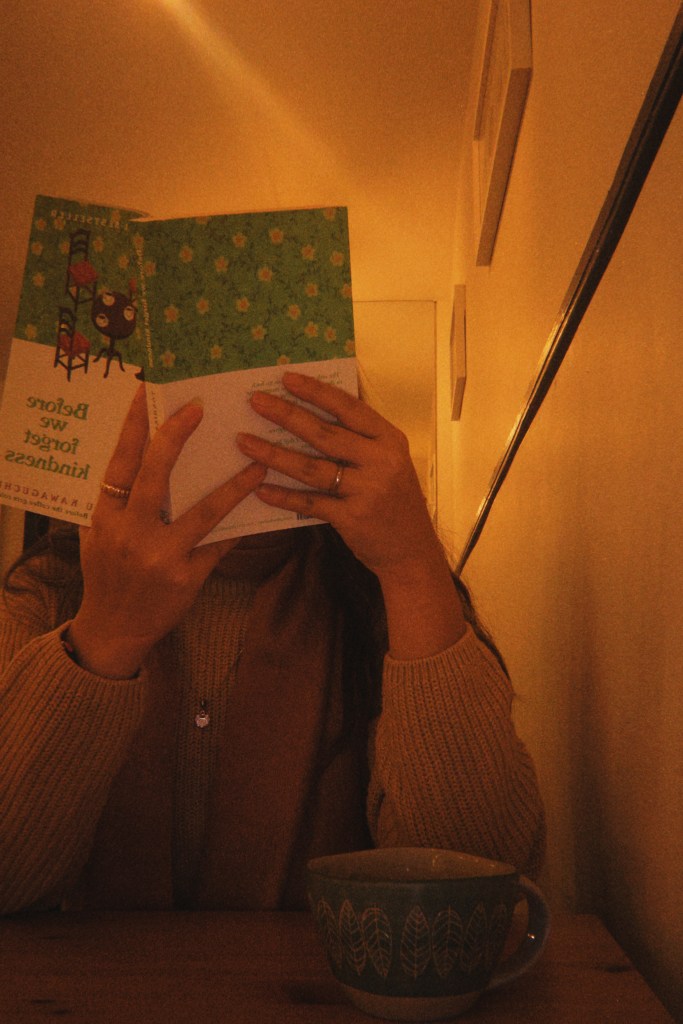 So I picked today: a slow, leisurely Saturday to park myself at a little Taiwanese cafe, a five-minute walk away from my hostel. With the arrival of winter meant the slow fading of autumn’s vibrancy, and the sky had darkened considerably despite it just being slightly over 4pm. The little bells hung on the door jingled softly as I pushed the cafe door open, and I shared an awkward eye contact followed by a little bow of greeting with the Taiwanese lady boss, who seemed surprised to receive a customer. After a quick order, I took my time settling down, taking off my coat and admiring the Studio Ghibli-inspired decor before taking a seat. I was the only customer in the adorably decorated cafe with soft piano music playing in the background, and as soon as the lady boss set my steaming cup of Americano down before me, I eagerly opened the book Before We Forget Kindness.
